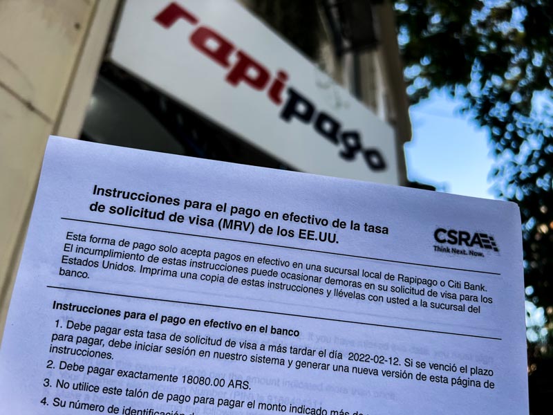 • Selecciona el tipo de visa y paga la tasa, puedes hacerlo con tarjeta o en Rapipago. Actualmente la opción mas económica es pagarlo en Rapipago, pagas directamente en pesos a una tasa preferencial que se llama “Dólar Consular” y es mas barato que el dólar tarjeta o el MEP.