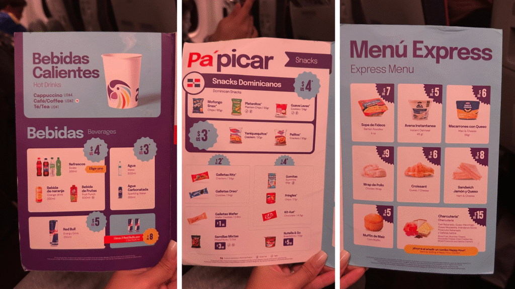 En cuanto al menú a bordo, no está incluido en el pasaje, pero sí ofrece opciones a precios muy accesibles. Lo que más me gustó es que incluyen marcas dominicanas, permitiéndote saborear un pedacito de la cultura local mientras estás en el aire. Ese toque auténtico le da una personalidad única a la experiencia de volar con Arajet. Para pagar aceptan dólares en efectivo (excepto billetes de 100 USD y monedas) o pesos dominicanos, también puedes pagar con tarjetas visa o mastercard y apple pay o google pay.